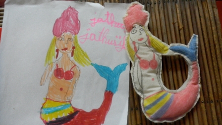 Inspiration…te voilà ! Un dessin d’enfant posé sur une table dans une maison autre que la mienne (j’ai quand même demandé l’autorisation avant de le piquer !) m’a donné l’envie de faire une poupette chérie.