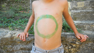 Il faut trois trucs par joueur : un bouclier (couvercle de casserole), un soft pinceau d’enfant et un bol avec de la peinture, rouge pour l’un, bleue pour l’autre. Dessiner ensuite, à l’aide de peinture jaune, une cible sur le ventre de chaque enfant.
