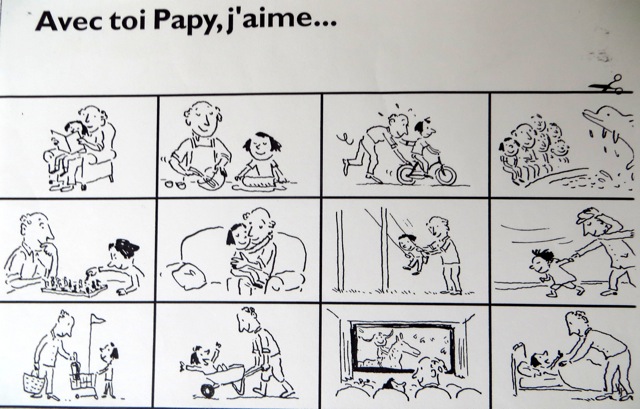 Oui le choix plaît, mais il le fait à l’envers en glissant toutes les cartes dans l’enveloppe, sauf celle du vélo, car ça, explique-t-il, « c’est avec Maman ou Papa que j’en fais» ! Et le grand-père de dire « ouf », car le vélo sur les trottoirs de Paris, ça c’est l’enfer !