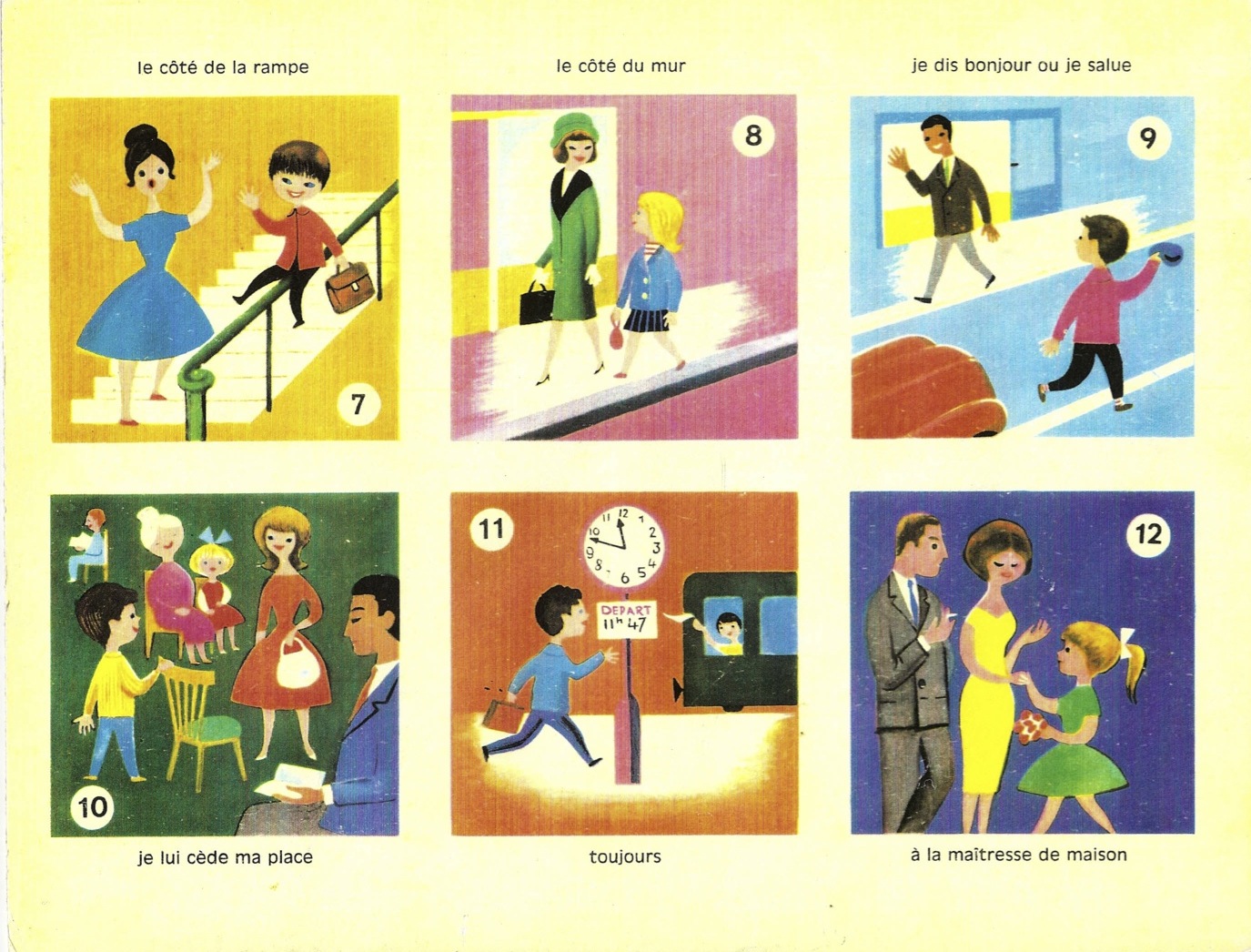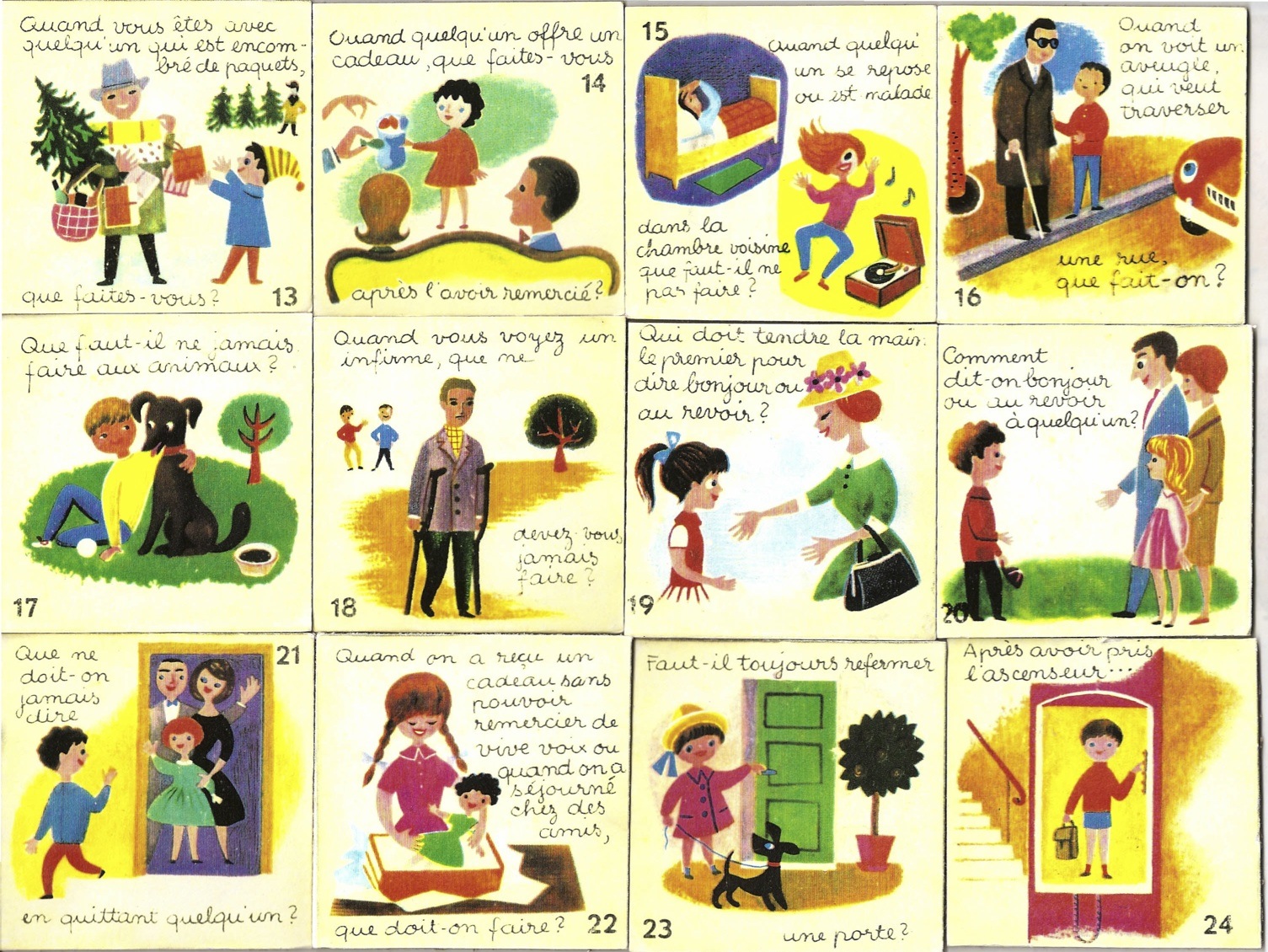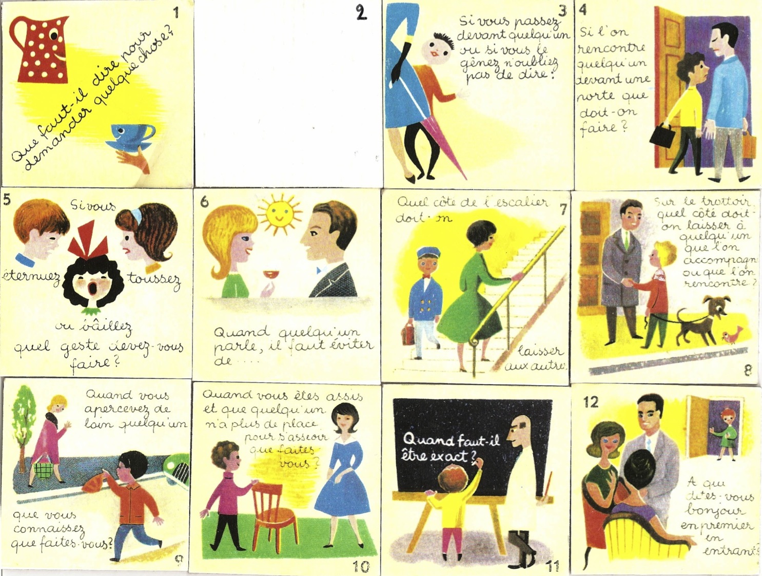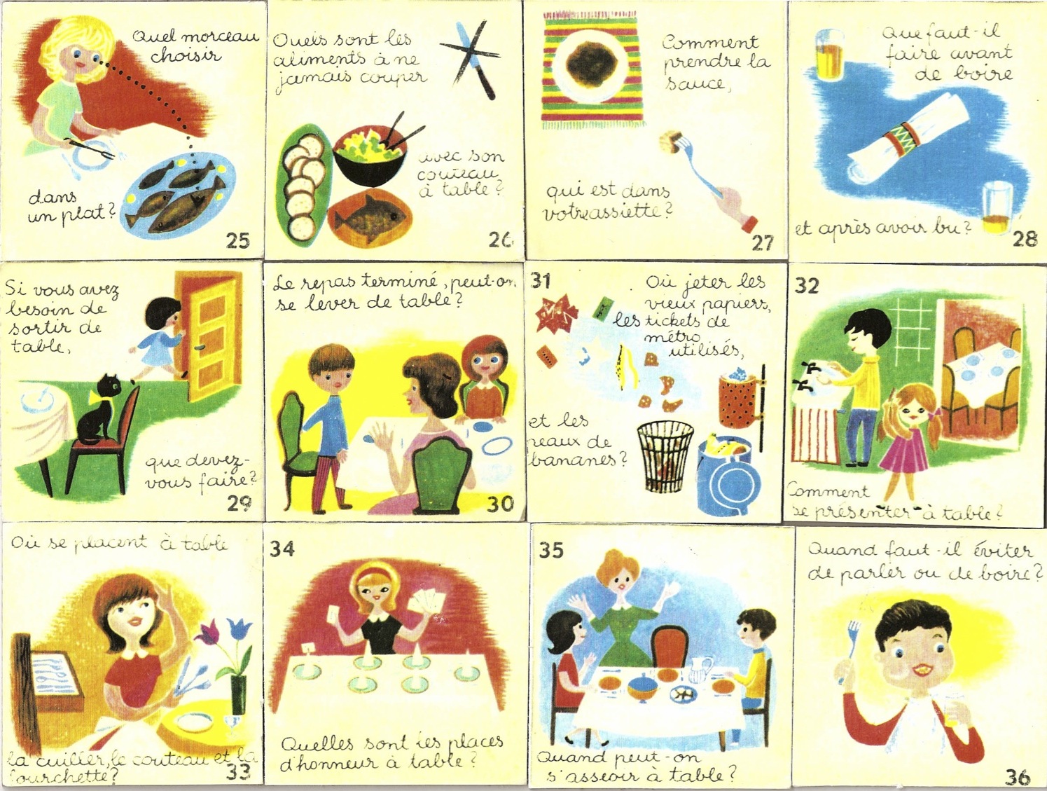 Le papa se rengorge quand sa fillouche trouve la bonne carte-réponse ! Bon, quand elle pioche la carte avec « l’infirme » elle sait bien sûr qu’on ne se moque pas, qu’on ne montre pas du doigt quelqu’un de différent, mais le mot vieillot sur la carte l’étonne un peu. La fin de repas devient cours de politesse et de vocabulaire. Le jeu permet d’être léger alors que, d’habitude, le sujet est un peu « gonflant » (sauf bien sûr quand c’est Philippe Dumas qui le traite). Alors je me dis que vous aussi ce jeu va vous amuser. Un jeu de loto gratuit, poli, joli. Il est le premier jeu éducatif ancien de ma collection à s’installer sur le blog, que vous pouvez imprimer et découper. Il y en aura beaucoup d’autres !