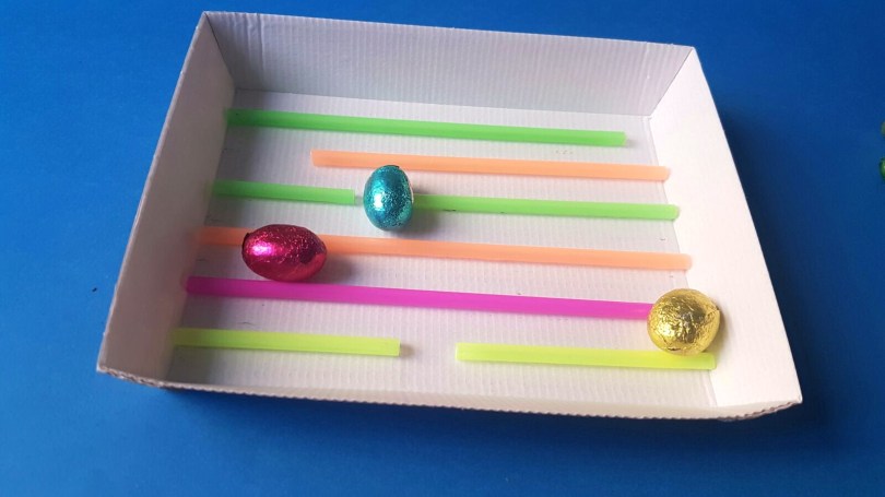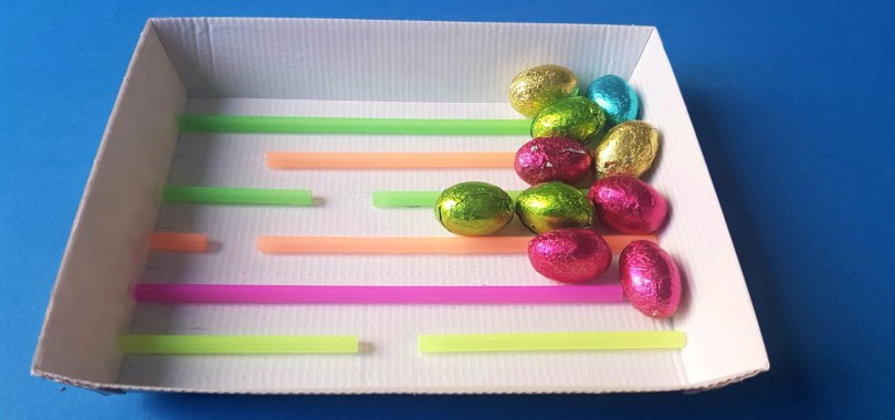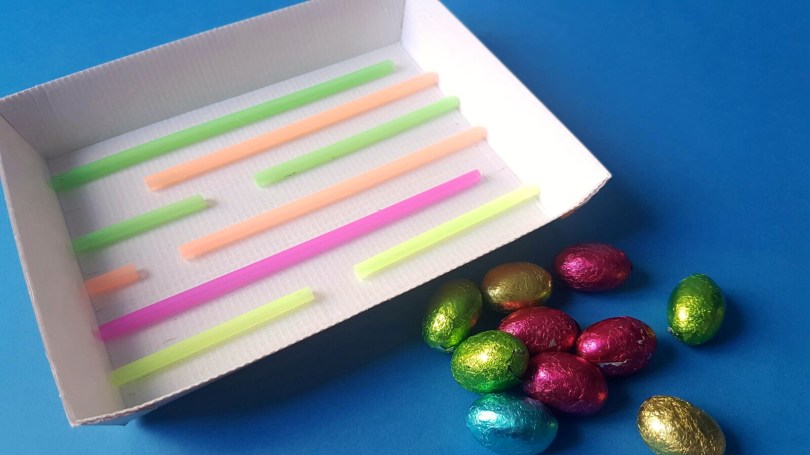 Oui, vous me connaissez, faut toujours que je bricole des petits jeux… Je vous avais déjà concocté une chasse aux œufs facile à organiser, mais en voilà un qui va permettre de se bouffotter quelques petits œufs en chocolat. Suffit d’une petite barquette en carton et de quelques pailles collées solidement pour fabriquer le plateau de jeu.