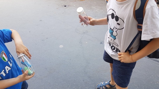 Je commence par leur mettre dans les mains une bouteille contenant des craies de sol bien humides (elles marchent mieux ainsi)