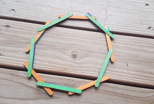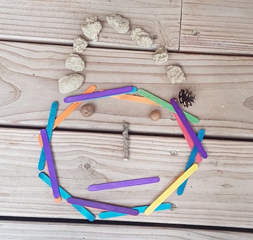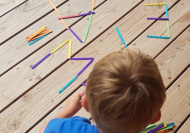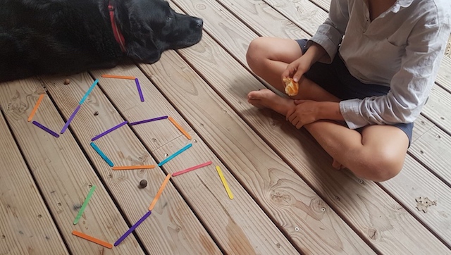 - Invention libre avec des formes simples par une autre joueuse qui s’empare de quelques bâtons de bois coloré … pur jeu libre qui ramène mes pensées à l’excellente pédagogie Froebel