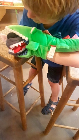 Puis je m’éloigne et je le vois s’emparer des marionnettes loup et croco pour entrer dans l’histoire avec « ses jouets vivants »