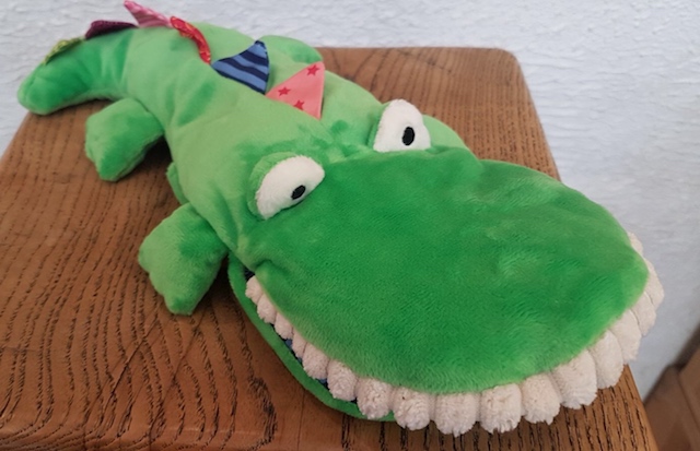 Z’aujourd’hui je raconte une fable ancienne à un gus passant par ici, “Le lion, le loup et le renard“. Je l’arrange en fonction des marionnettes-gants qui me tombent sous la main quand je me balade dans la shop. J’ai bien un loup mais point de renard! Je le remplace dans “ma“ fable par un beau croco bien dentu…