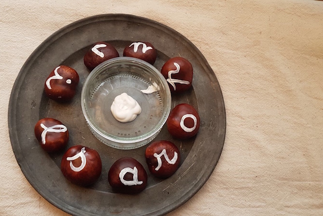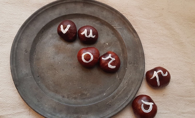 Les marrons sont du matériel pédagogique de premier choix pour fabriquer facilement un jeu de lettres. Allez-y, choisissez les moins rebondis, tracez à la gouache blanche quelques lettres qui serviront à composer des mots simples, de ceux que les enfants ont l’habitude de dire ou d’entendre dans les conversations (bol, sac, roi, vu, oui…)