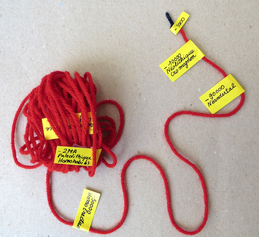 Quand je veux expliquer à des enfants les périodes correspondant à l’évolution de l’Homme je commence par aborder la notion de temps… C’est si loin tout ça… Heureusement que j’ai toujours sur moi ma pelote du temps.