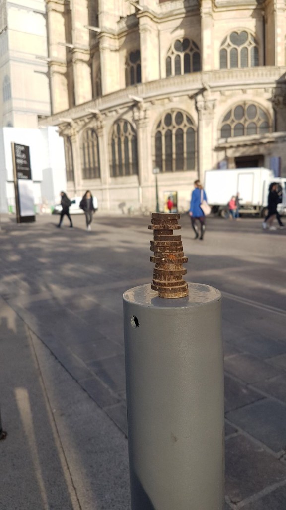 Après un trajet en métro, arrivée aux Halles. Je sors à nouveau les rondelles de ma poche. Empilement d’art entre Saint Eustache et le futur musée Pinault ( psst le Monsieur Pinault tu voudrais pas que l’œuvre photographiée fasse partie de ta collec’ ?)
