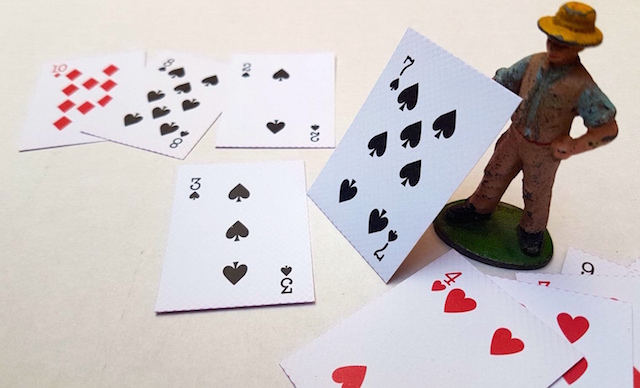 Au même nombre, mais cette fois avec un jeu de cartes sans les figures. Je distribue 6 cartes à chaque joueur (entre 2 et 4) et le reste forme la pioche. Le premier joueur place une carte face visible sur la table et le joueur suivant abat à côté de la carte le même nombre affiché avec une ou deux cartes. S’il ne peut pas jouer il passe son tour et pioche une carte. Puis c’est au joueur suivant d’abattre ses cartes. Le gagnant est celui qui s’est débarrassé de toutes ses cartes ou qui a le moins de cartes quand plus personne ne peut faire le même nombre avec ses cartes restantes. Bien pour le calcul mental !