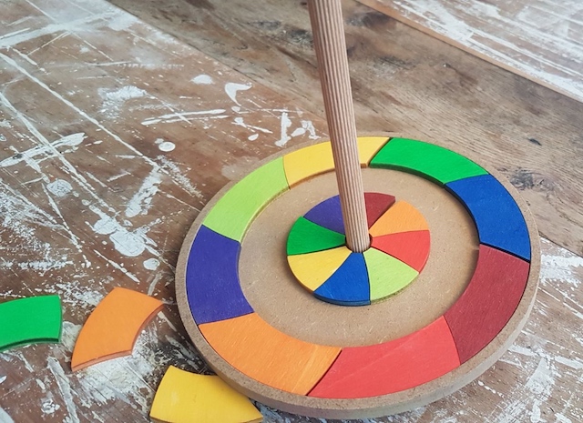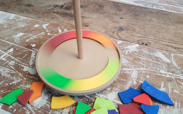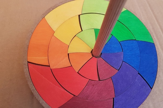 Une grande toupie en bois, en pièces détachées, aux couleurs du cercle chromatique de Goethe.