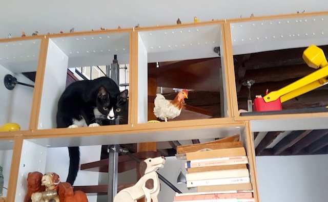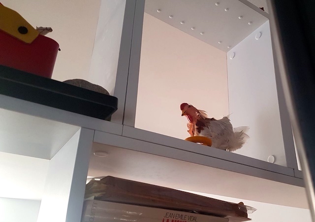 Pour le « en l’air » J’ai caché l’anneau près de ma poule vintage, là tout en haut d’une étagère