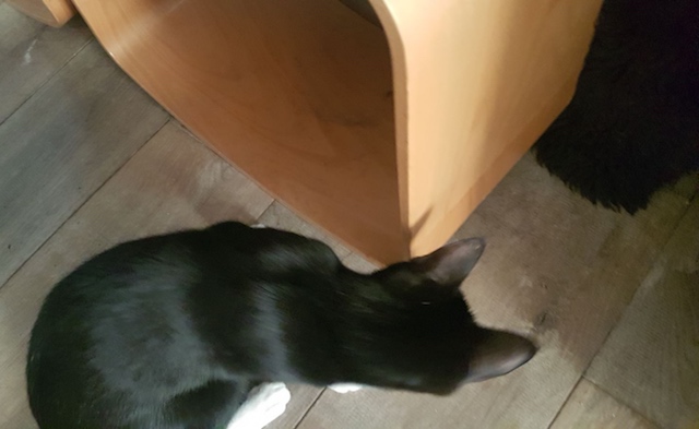 Le félin cherchait pas vraiment là où il fallait, mais il a eu sa récompense en trouvant sous le tabouret une croquette bien méritée !!!!