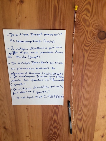 - Je critique Alain Gérard qui me jette par terre pour prendre la corde et qui profite que mon pain et mon fromage sont sur le mur pour manger mon pain et me dire : la crotte (Ariane)