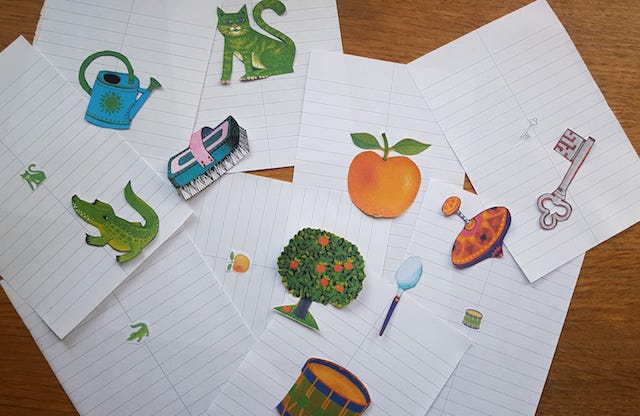 Si vous voulez faire comme moi, préparez d’abord deux séries de feuilles avec des images trouvées dans un imagier, ou comme ici avec celles d’un jeu de loto vintage. Je les ai photocopiées, réduites au max afin de les miniaturiser, découpées. Puis j’ai collé chaque image sur une feuille de papier.