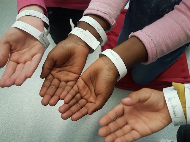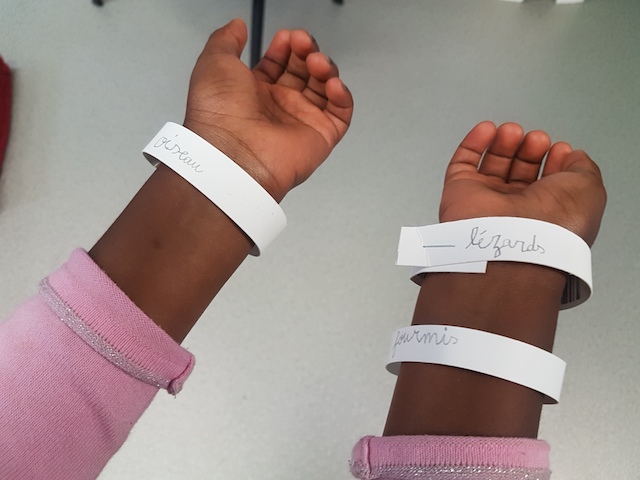 … j’en profite toujours pour m’offrir une belle petite image souvenir. Hier ce sont ces photos prises après une séance de “chasse aux mots“. Après avoir chassé dans des livres, en deux équipes, pour l’une des noms d’animaux, pour l’autre des mots de 5 lettres, tous les enfants les ont écrit sur des bandes de papier… les “bracelets à mots“.