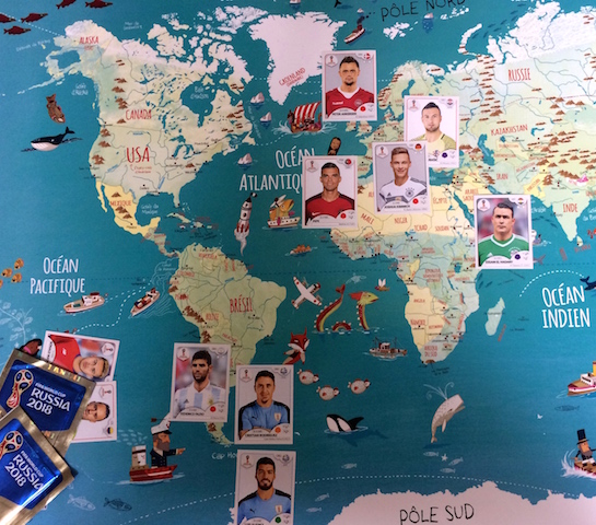 Dans l’une le planisphère Vilac sert à placer les images que collectionnent (évidemment !) deux gus de 5 et 9 ans. À chaque joueur son pays !