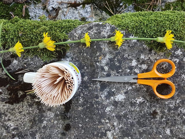 Elle est + + + + facile à faire/ Suffit d’une tige de lavande ou de n’importe quelle autre herbasse fine et rigide/ Des pissenlits/ Des piques en bois et des ciseaux.