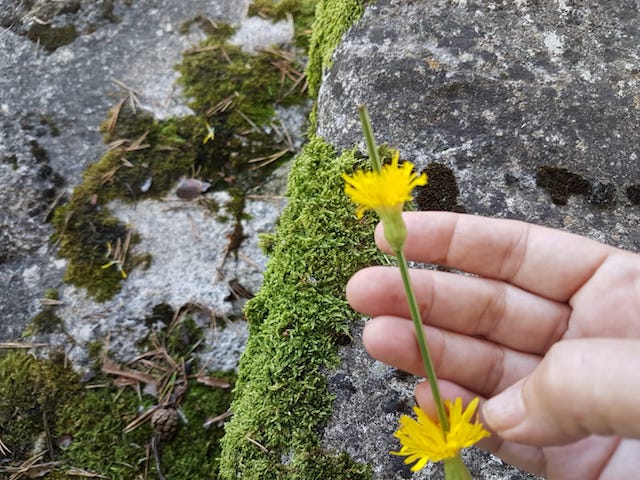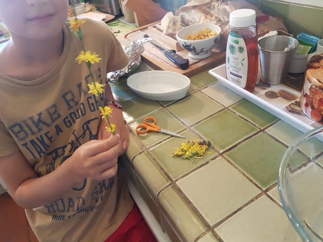 C’est une jolie idée d’enfiler les pissenlits sur un autre végétal. On pourrait essayer sur une « liane » de clématite sauvage pour faire une guirlande. J’ai la clématite mais pas les pissenlits, je ne peux pas tester…
