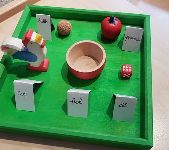 Proposez ce jeu de lecture où l’on place les objets derrière une étiquette portant leur nom. On retire ensuite deux étiquettes que l’apprenti lecteur devra replacer au bon endroit.