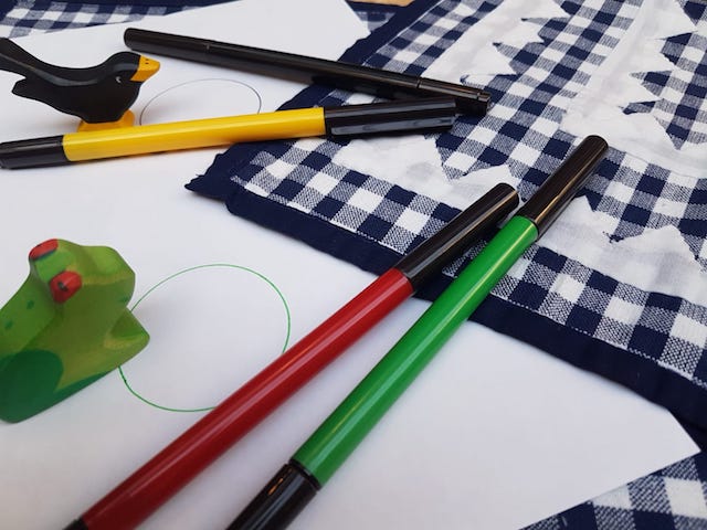 J’ai poursuivi par un truc genre « diagramme camembert » en mettant en couleur un rond dont chaque partie coloriée équivaut au pourcentage de peinture de ces deux bêtes. Plus de rouge ou de vert pour mettre en couleur c’te grenouille ? Plus de noir ou de jaune pour mettre en couleur maître corbeau?