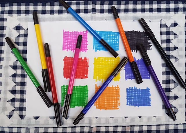 (* pour info on commence à nommer les couleurs les plus courantes vers 2 ans puis,progressivement et jusqu’à 5 ans, on ajoute des adjectifs aux noms pour préciser la teinte, bleu ciel, bleu marine, vert olive, jaune citron et l’on apprend des noms moins usuels : beige, gris, mauve…)