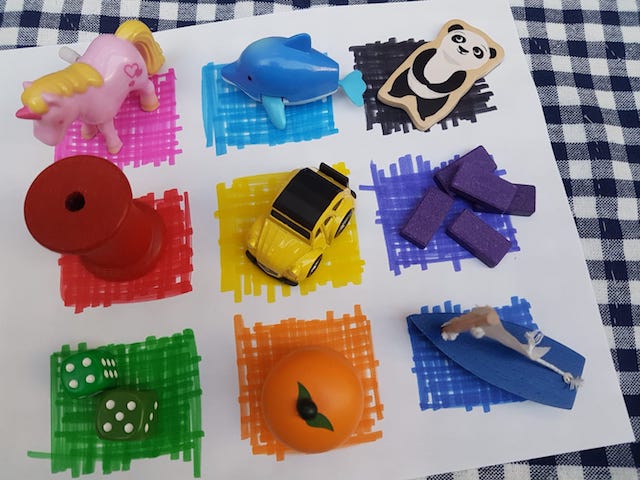 Partir à la chasse aux trucs colorés en cherchant dans les 1001 mini jouets du Si Tu Veux (ou chez vous dans la chambre de votre titi) ceux correspondant à la couleur de chacun des carrés. Une fois la chasse aux jouets terminée, il s’agira de les poser en veillant bien, à chaque fois, à les nommer : « la bobine est rouge, le mini bateau est bleu, la petite deux chevaux est jaune, les dés sont verts, les dominos sont violets… »