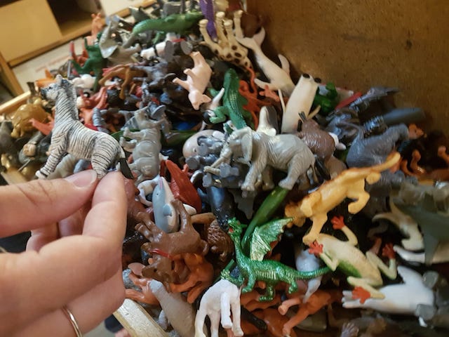 On poursuit en mettant dans un même panier 2 ou 3 bestioles dont les sons d’attaque sont très différents (ccccccrocodile, chhhhhhhien, gggg-irafe …), puis on demande au gus d’apporter un des animaux. Je vois un animal dont le nom commence par chhhh. Le vois-tu ? Peux tu me le donner ?