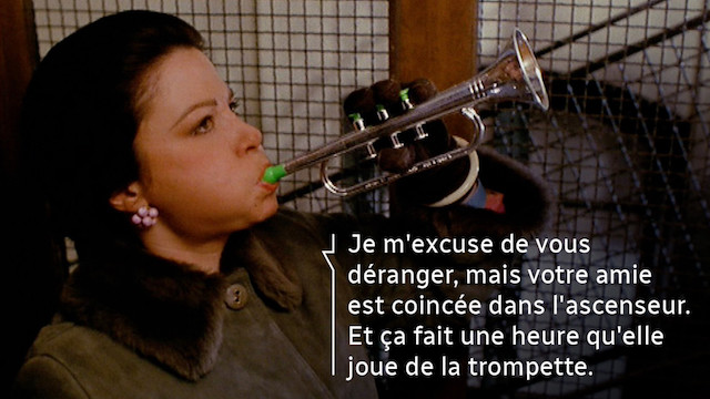 Revoir à la télé pour la dixième fois “Le père Noël est une ordure“ a été mon délassement de marchande de jouets vannée-crevée, un de ces derniers soirs. Et voilà –ti pas que me saute aux yeux un truc de dingue : Là ! là ! Quand madame Musquin, coincée dans l’ascenseur, ouvre les cadeaux destinés à ses neveux pour chercher un truc qui va lui servir à alerter de sa cata-situation… elle arrache le papier cadeau enveloppant une trompette … la porte à sa bouche… fait sortir des sons cacophoniques du jouet musical…