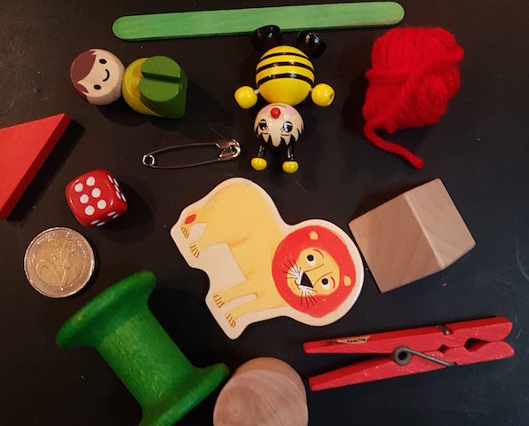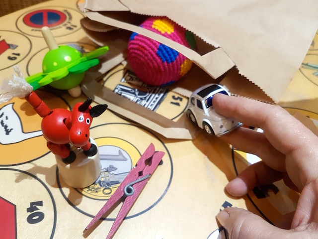 Et c’est parti ! On glisse un même nombre (une dizaine ou plus) de joujoux (tous différents) dans deux sacs puis on s’assied côte à côte, avec pour chacun, un sac à joujoux devant lui et un sac vide accroché par une pince à linge dans le dos.