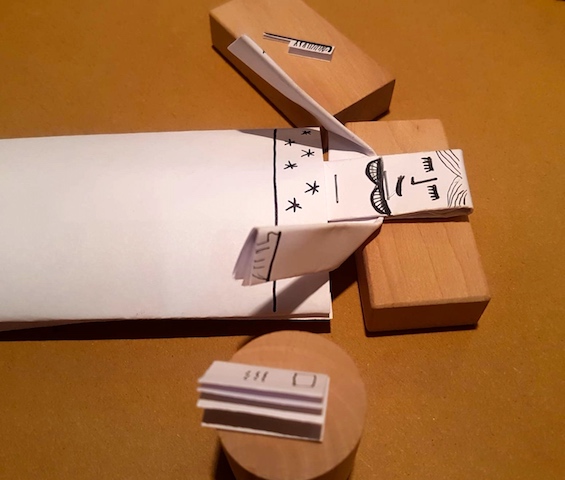 D’abord c’est la fabrication de la plus simple des poupées qui m’intéresse : Un rectangle de papier plié plusieurs fois (en 2, en 4, en 6) dans le sens de la longueur, puis replié en deux : c’est le corps. Un autre plus petit plié de même façon et placé à hauteur des bras. Une agrafe maintient les bras à leur place. Cette poupée a l’avantage de pouvoir tenir debout.