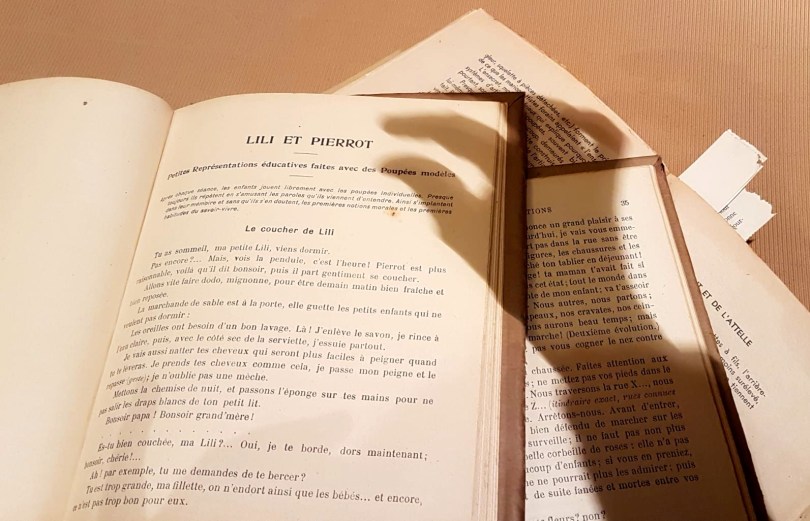 Je feuillette un livre ancien de pédagogie active qui s’adresse aux enseignants de maternelles. Un chapitre s’intitule: « Petites représentations éducatives faites avec des poupées modèles »