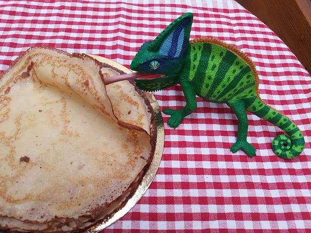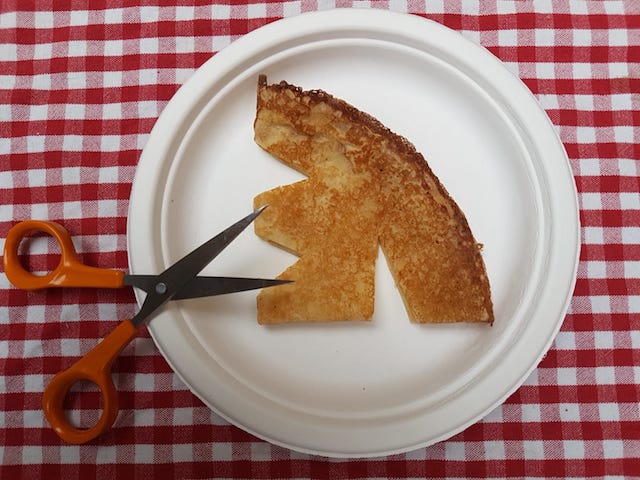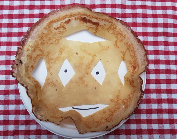Crêpe créative, en s’amusant à faire des découpes dans sa crêpe pour en faire un napperon ou une sacrée trombine avant de la manger.