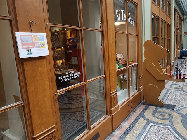 Cette affichette-là est désormais en bonne place à l’entrée du magasin de jouets de la galerie Vivienne.