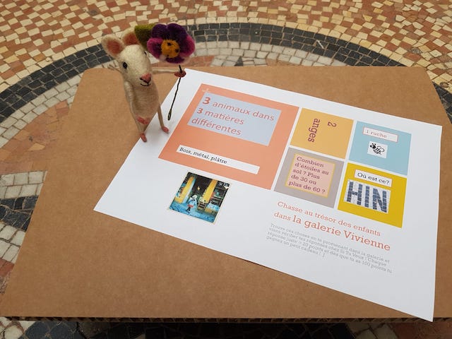 Pour que les enfants, après l’avoir lu, partent, nez au vent ou z’yeux z’au sol, à la recherche d’éléments du décor de la belle galerie parisienne. Ce qu’ils auront découvert leur fera gagner des points … des points qui feront gagner des pièces d’or…