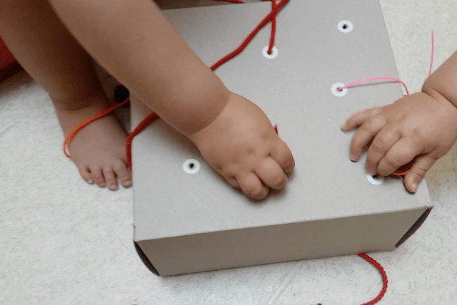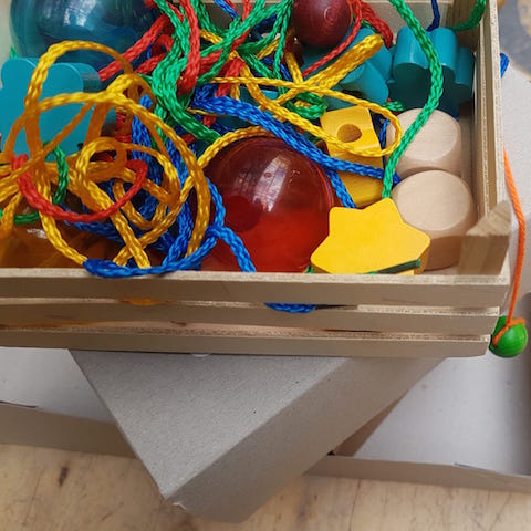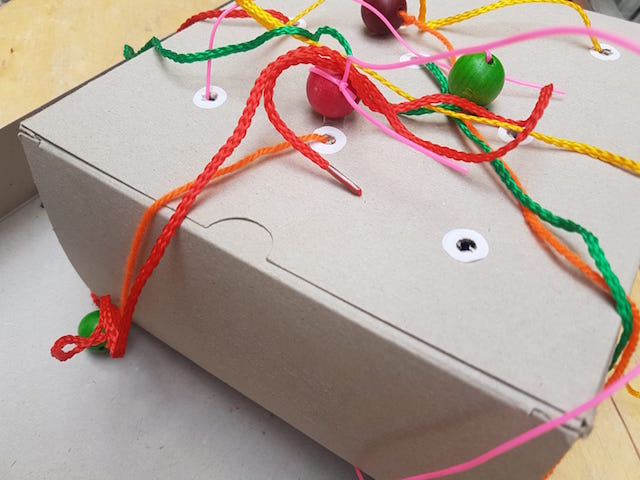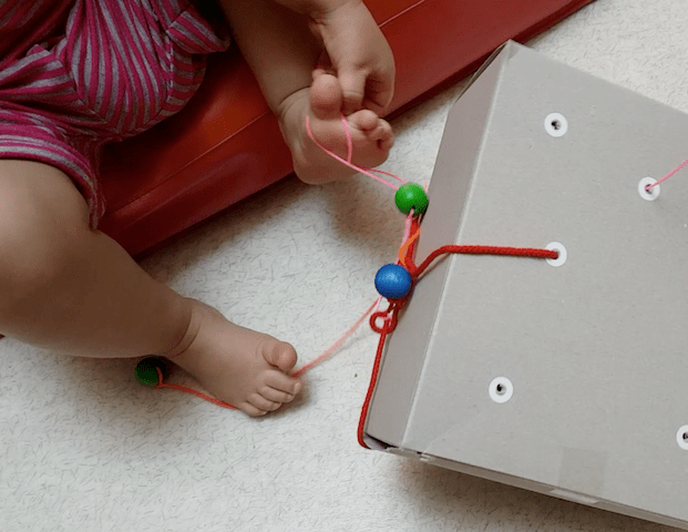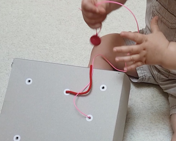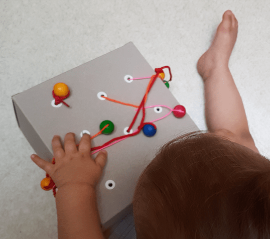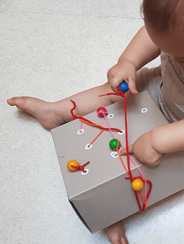C’est un jour où j’ai le plaisir d’être invitée par des bébés dans leur crèche ! J’ai amené quelque matériel “fait môa“ : des perles du Si Tu Veux attachées solidement aux deux extrémités d’un lacet et traversant une boîte en carton.