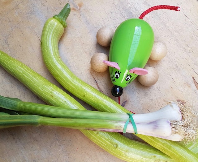 Dès mon arrivée chez le Si Tu Veux la tronche délirante des courgettes niçoises ayant poussé au soleil du sud m’incite à m’en servir pour “sublimer“ la belle souris verte fabriquée dans le Jura !