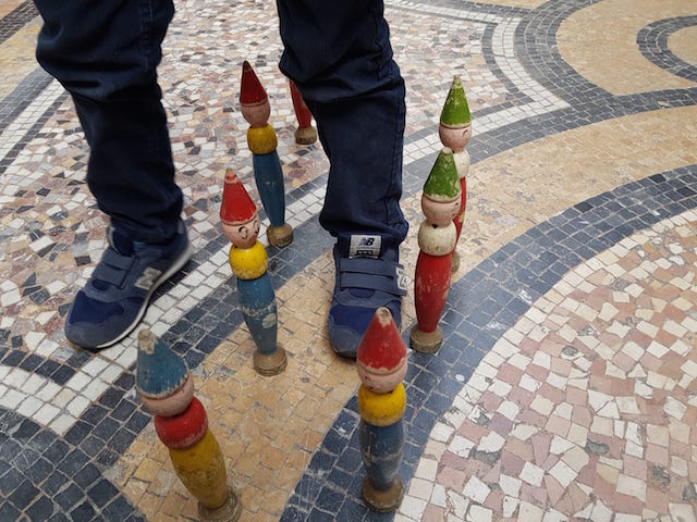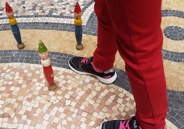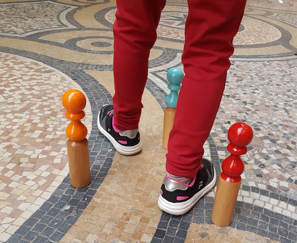 Mais moi, après plusieurs partie de ce jeu-là, j’en ai proposé un autre, tout aussi extra. S’agit de passer en marchant, puis en courant dans tous les sens et entre les quilles, sans en faire tomber une seule !