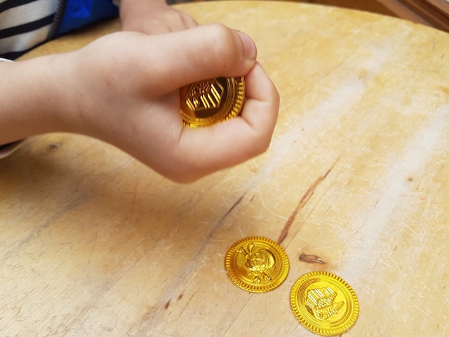 Des pièces que j’ai eu l’idée d’utiliser aussi pour faire travailler le pouce, l’index et le majeur… jeu utile pour atteindre, lorsque viendra le moment d’écrire, un summum de dextérité. « Ramasser les pièces d’or en gardant les autres pièces bien serrées dans le creux de sa main ? C’est trop fastoche « me dit le gus de 5 ans à qui je propose ce jeu.