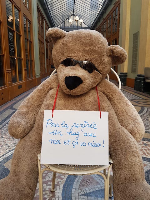 Et oui, voilà la surprise que je prépare pour les petits écoliers qui vont passer par la galerie Vivienne lundi prochain. Et vous, si vous faisiez pareil en plaçant un nounours à câlins sur le seuil de votre appart’ ou de votre maison? Boune idée ness-pa ?