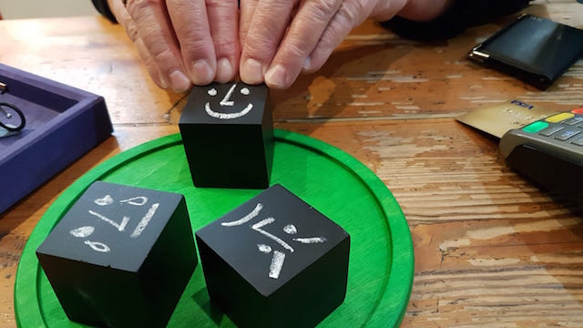 Bon, j’avoue que je n’ai pas pu résister à tester les cubes à émotions avec la première de-la- madame passant faire ses emplettes de par ici, ce matin. « C’est très sympa comme idée ! » qu’elle dit « Et je mets mes deux mains sur le cube, rien que pour montrer mon contentement ! » qu’elle ajoute.