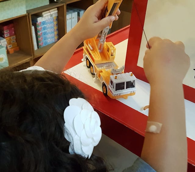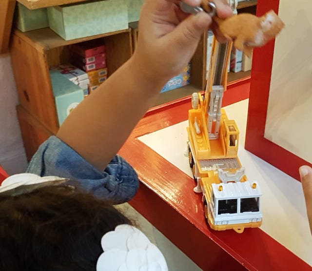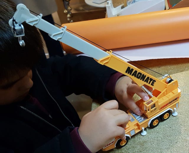 La mum et moi on hoche la tête en la regardant soulever un chat de plastoc à l’aide de sa grue.