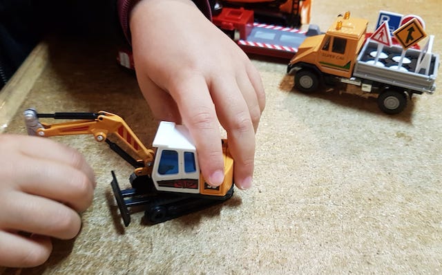 Me reste plus qu’à vite commander le même genre de véhicule pour les petits visiteurs du Si Tu Veux. Ah, j’ai même pas le temps de déballer pelleteuse, camion grue et camion benne qu’un minus, tout juste sorti de l’école et passant faire un tour ici, se jette dessus.