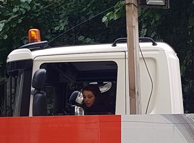 1 /Mon œil est agréablement surpris quand j’aperçois une  djeun’femme au volant d’un giga, vraiment giga, camion de chantier.