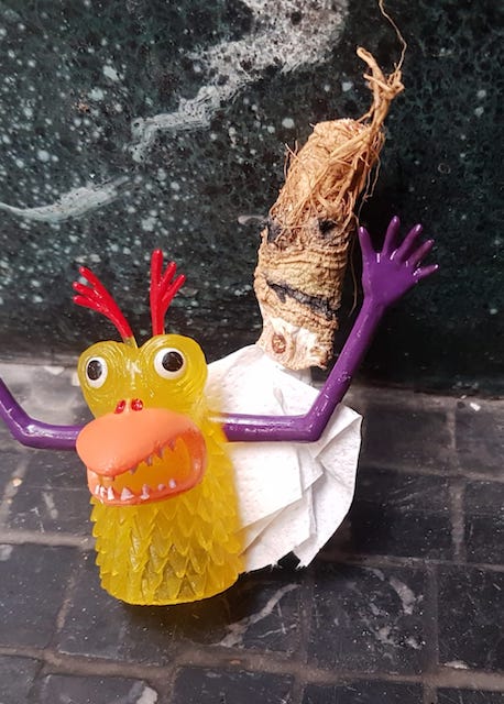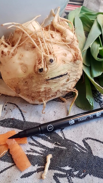 Pour Halloween vlà que je décide cette année de remplacer la citrouille, si « chi…e » à  creuser, par une demi boule de céleri, z’avec tronche décorée de carotte et de clous de girofle. Ah comme il est bon de libérer sa créativité avec du céleri… plutôt que d’en faire de la soupe !