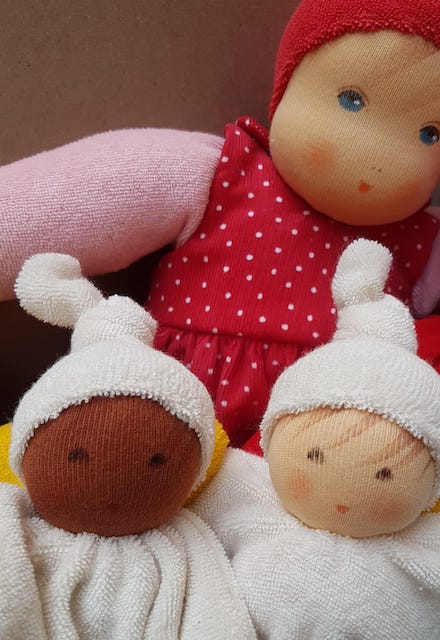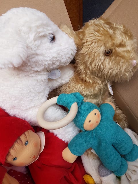 Alors il me fallait partager avec vous l’émotion qui m’a envahie quand j’ai commencé, hier soir, à déballer ces magnifiques poupées en tissu et animaux en peluche, “dénichés“ dans de bonnes maisons traditionnelles, après moult recherches, en France et en Allemagne…