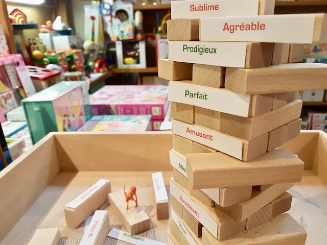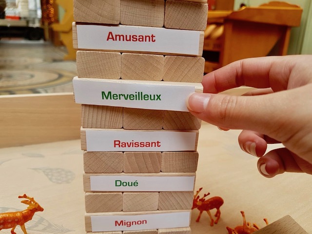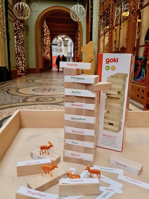 Et hop, voilà une variante pour y jouer à 2 ou à 3 à la maison en scotchant 24 étiquettes, comme je l’ai fait, sur le célèbre jeu de la tour chancelante.
