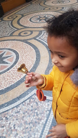 Dernier jour avant Noël et hop, je mets la pression aux enfants ! En voilà une chargée de faire monter l’ambiance en se servant de la cloche de Noël du Si Tu Veux dans la galerie Vivienne, pour rappeler au Père Noël que, de par-ici-dans-le-Paris, on l’attend de pied ferme.