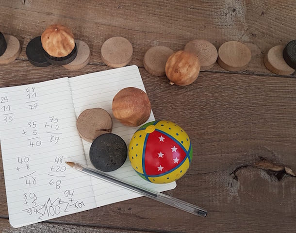 Après le lancer, compte le nombre d’éléments qui sont tombés. Forme ronde : 5 points, Pion :1 point. Additionne les points, et écris le résultat sur une feuille de papier. (Avec un petit coup de pouce des parents pour les plus jeunes)