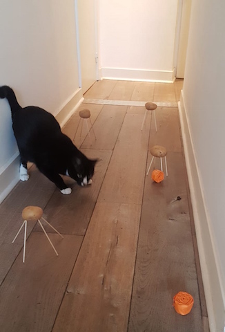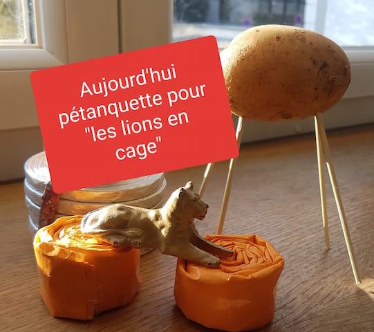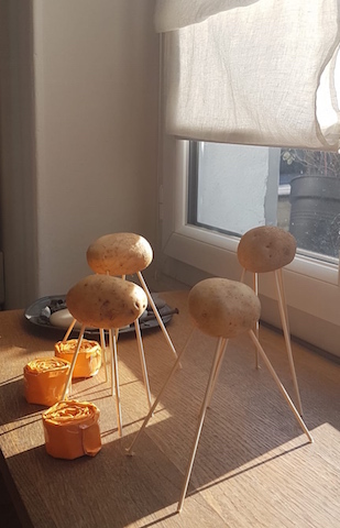 - Pour faire tes cochonnets plante 4 piques en bois dans des pommes de terre en vérifiant que ton palet aura bien la place de se glisser entre les “pattes“.