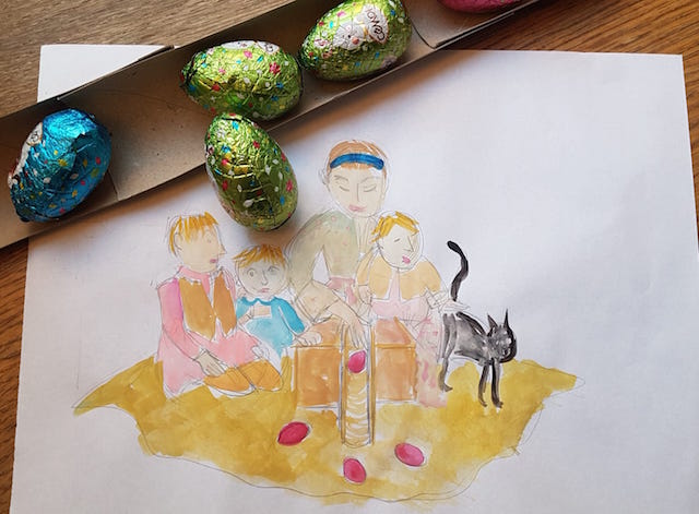 Pour ma part j’ai choisi de peinturer en 3 coups de crayon, suivis de 3 coups de pinceau, cette charmante scène de jeu.